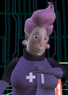With her +1 armor and her frying pan she protects Reality 2.0's mail system from being tampered with. Sam & Max eventually defeat her using a +2 Sword and a bunch of pop-ups. Auntie Biotic looks and sounds exactly like Myra Stump.