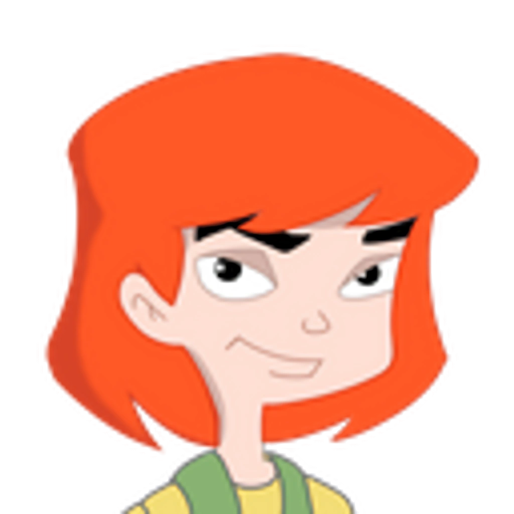 The Geek is 12 years old and has short red hair with green eyes. She wears a yellow-striped shirt, green vest (with buttons), red skirt, white socks and green shoes.
