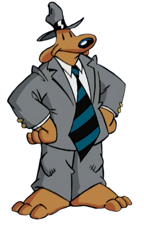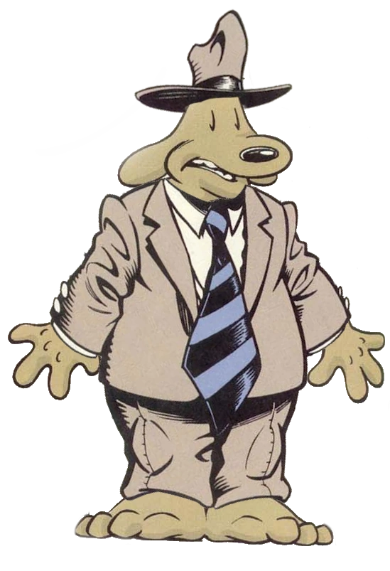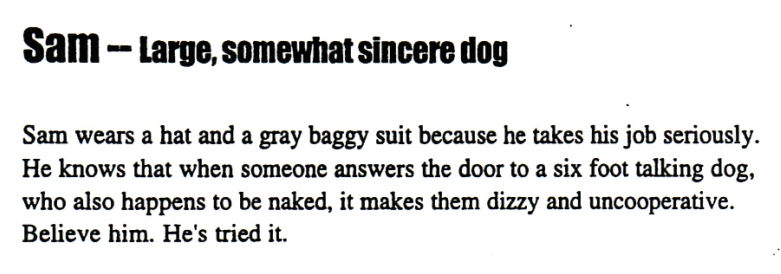 Sam is a 6-foot-tall, brown anthropomorphic dog with black pupils. He wears a grey Bloodhound fedora, as well as a grey (sometimes Green or blue) suit with a white dress shirt, and black belt with a golden buckle, meant to mimic a typical noir detective outfit. He wears a comically large neck tie with black and blue stripes. Underneath his suit jacket, he presumably wears a leather shoulder holster. Despite his body being anthropomorphic, he only has four fingers (including his thumbs) and three toes. He refers to himself as an Irish wolfhound in On the Road.