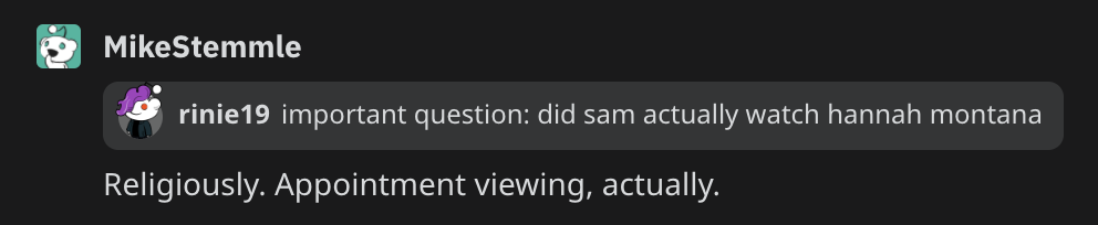 - According to Mike Stemmle, Sam likes Hannah Montana.
